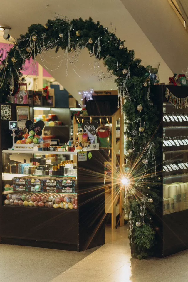"Новогоднее оформление островка натуральной косметики и парфюмерии.