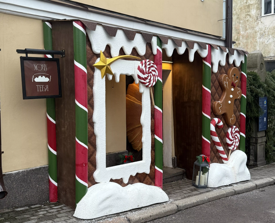"В этом году наш фасад превратился в настоящий пряничный домик из рождественской сказки. Будто сошедший со страниц любимых детских историй, он манит ароматами корицы, ванили и тёплой выпечки ещё с улицы. За этой пряничной дверью — не декорация, а живая магия: выпечку здесь готовят прямо при гостях, глазурь блестит, тесто поднимается, а воздух наполнен сладким уютом. Здесь можно согреться, наесться сладостей без угрызений совести и почувствовать себя гостем сказки. Наш фасад — это приглашение остановиться, улыбнуться и поверить, что чудеса случаются."